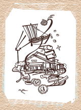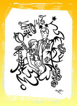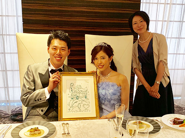 下では皆がBBQをしながらお二人を祝福している、そんな楽しい絵に仕上げました。